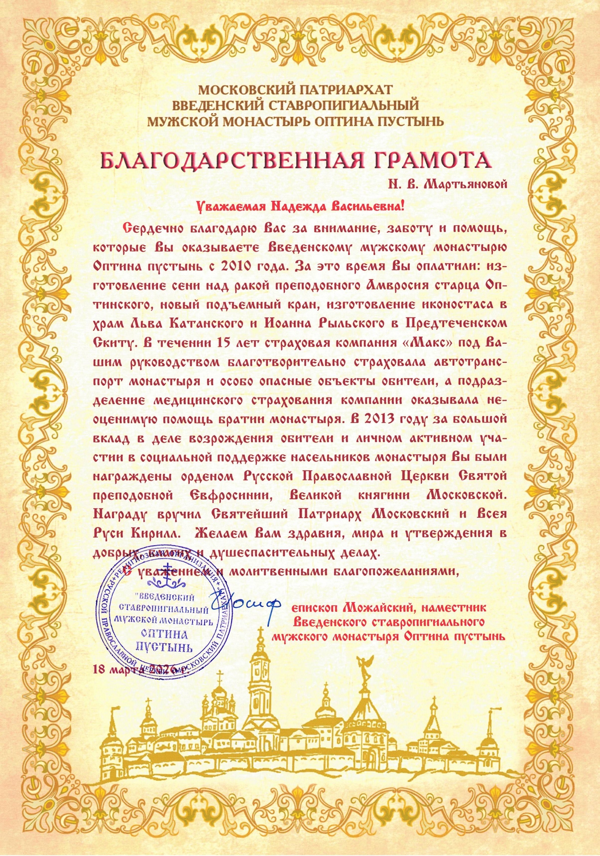 Благодарственная грамота Оптина Пустынь