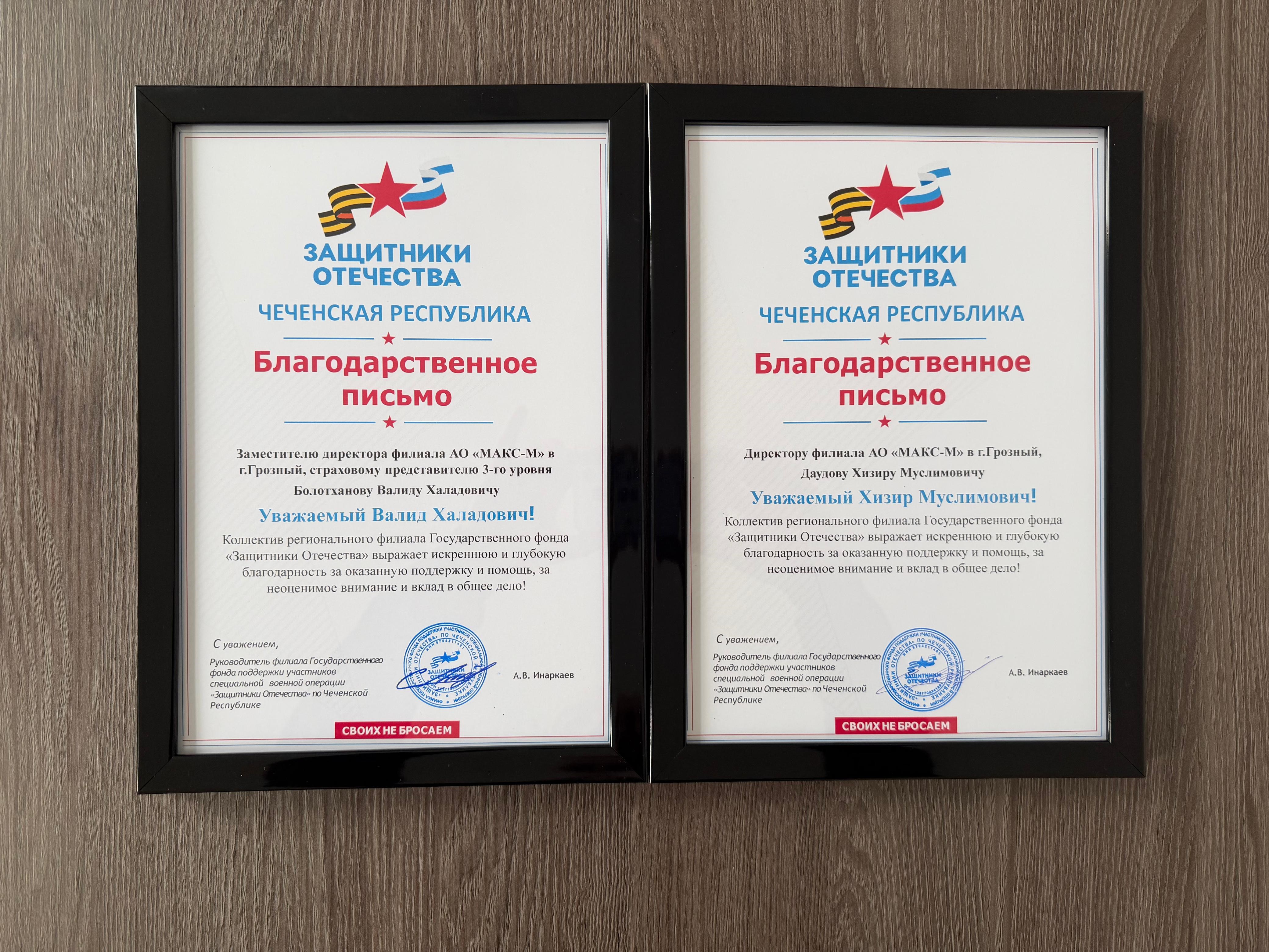 Директор филиала страховой медицинской компании «МАКС-М» в г. Грозный Хизир Даудов и заместитель директора, страховой представитель третьего уровня Валид Болотханов отмечены благодарственными письмами филиала Государственного фонда «Защитники Отечества» по Чеченской Республике.Во время торжественной церемонии представители фонда подчеркнули: «Ваша работа — это не просто выполнение профессиональных обязанностей. Это настоящее служение людям, которые защищали нашу страну. Благодаря вашей чуткости и компетентности многие ветераны, а также члены их семей получают необходимую помощь вовремя и в полном объёме. Каждый из вас ежедневно демонстрирует высокий профессионализм, готовность идти навстречу в сложных ситуациях».